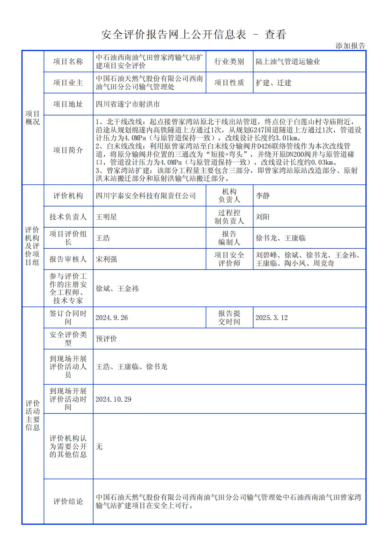 » 中石油西南油气田曾家湾输气站扩建项目安全评价报告