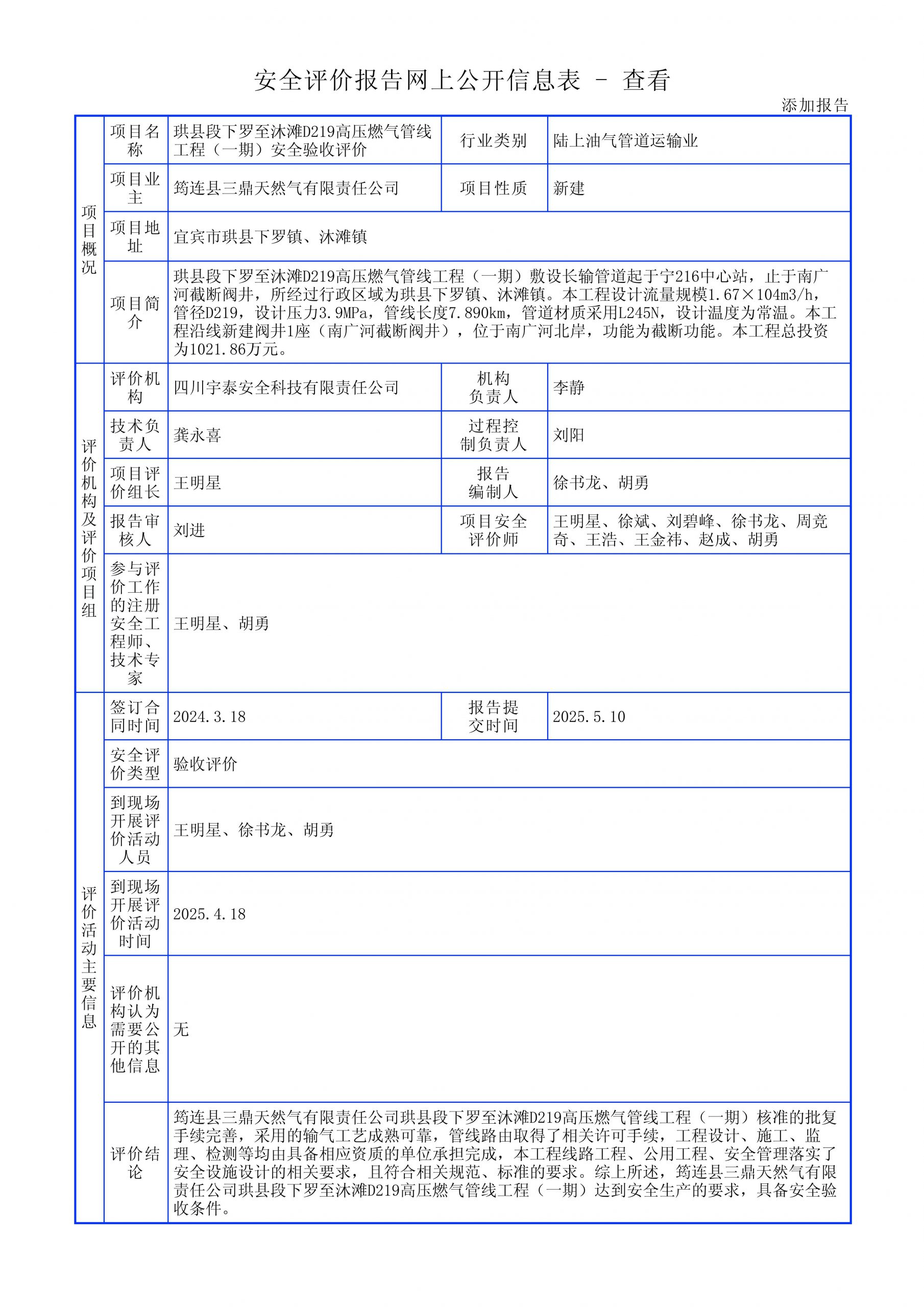 珙县段下罗至沐滩D219高压燃气管线工程(一期)安全验收评价报告