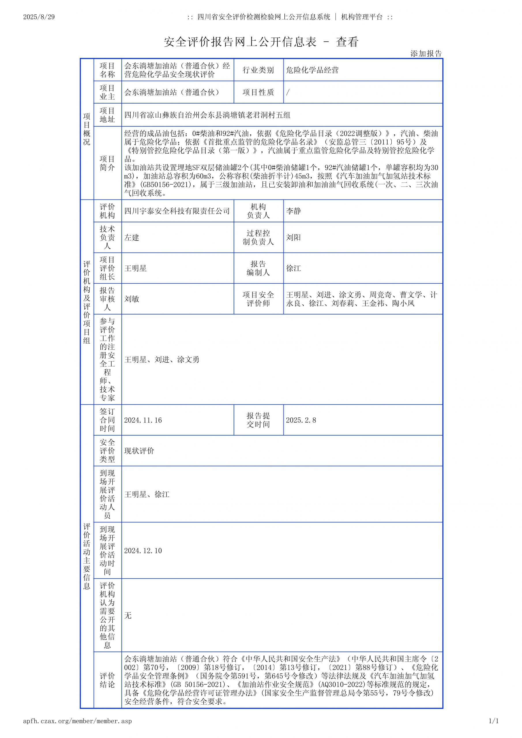会东淌塘加油站(普通合伙)经营危险化学品安全现状评价报告