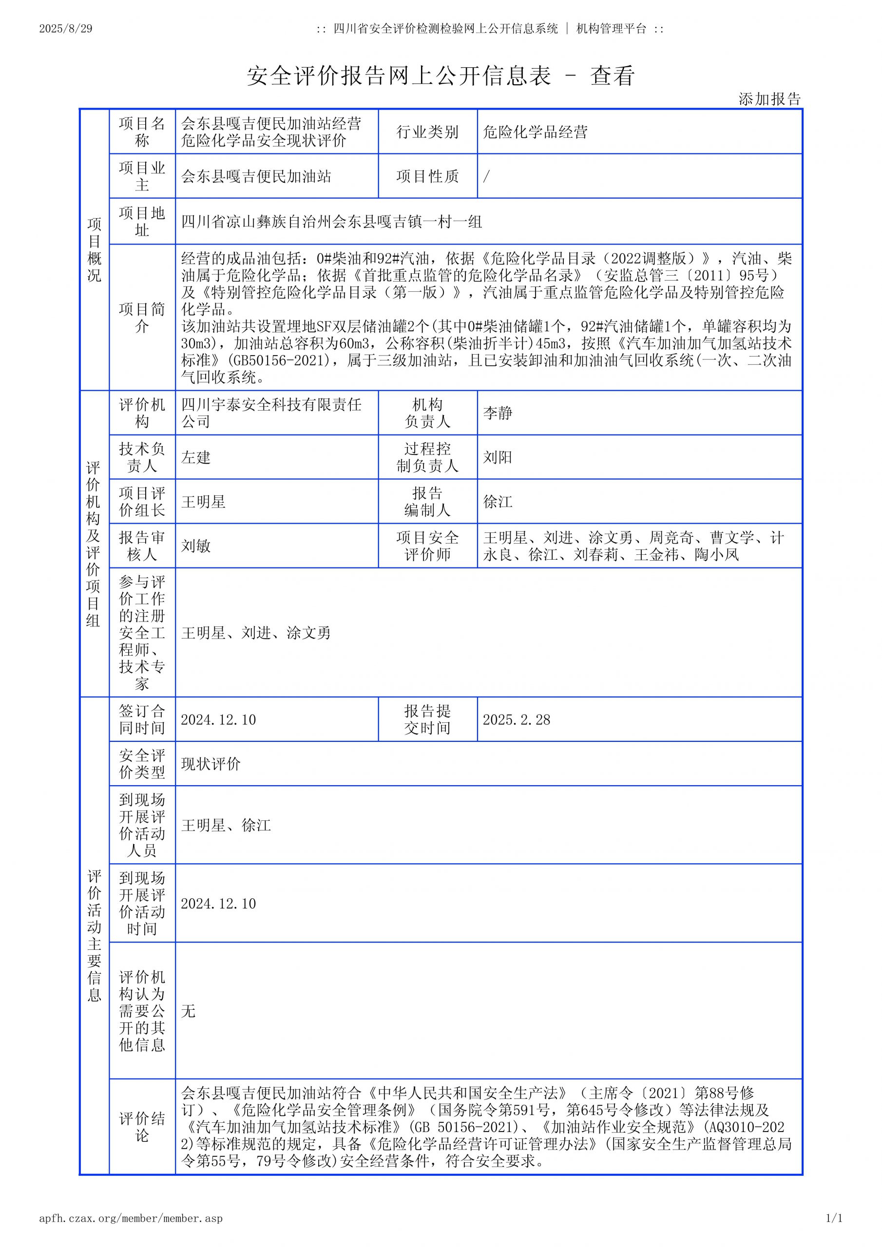 » 会东县嘎吉便民加油站经营危险化学品安全现状评价报告