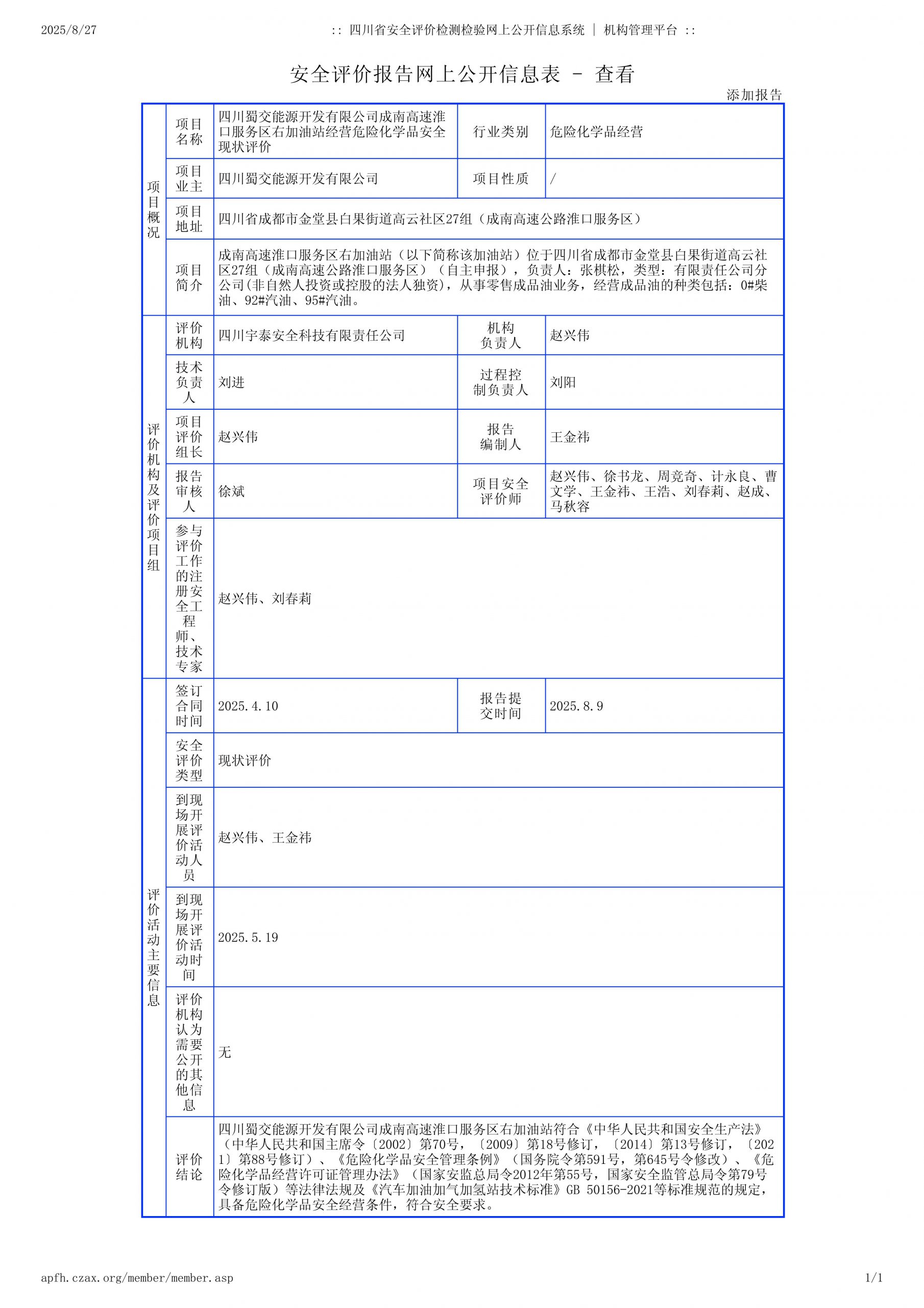 四川蜀交能源开发有限公司成南高速淮口服务区右加油站经营危险化学品安全现状评价报告