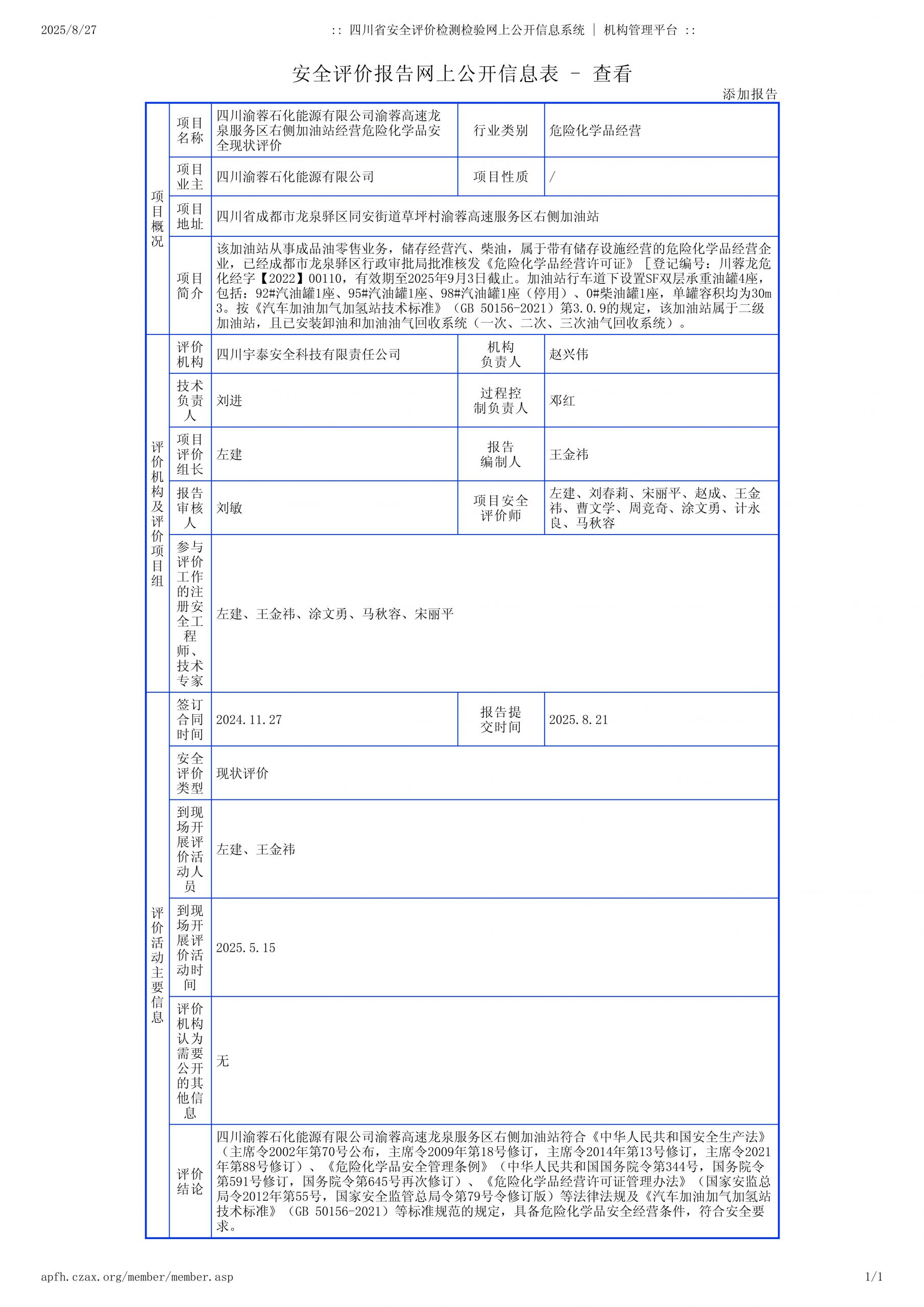 四川渝蓉石化能源有限公司渝蓉高速龙泉服务区右侧加油站经营危险化学品安全现状评价报告