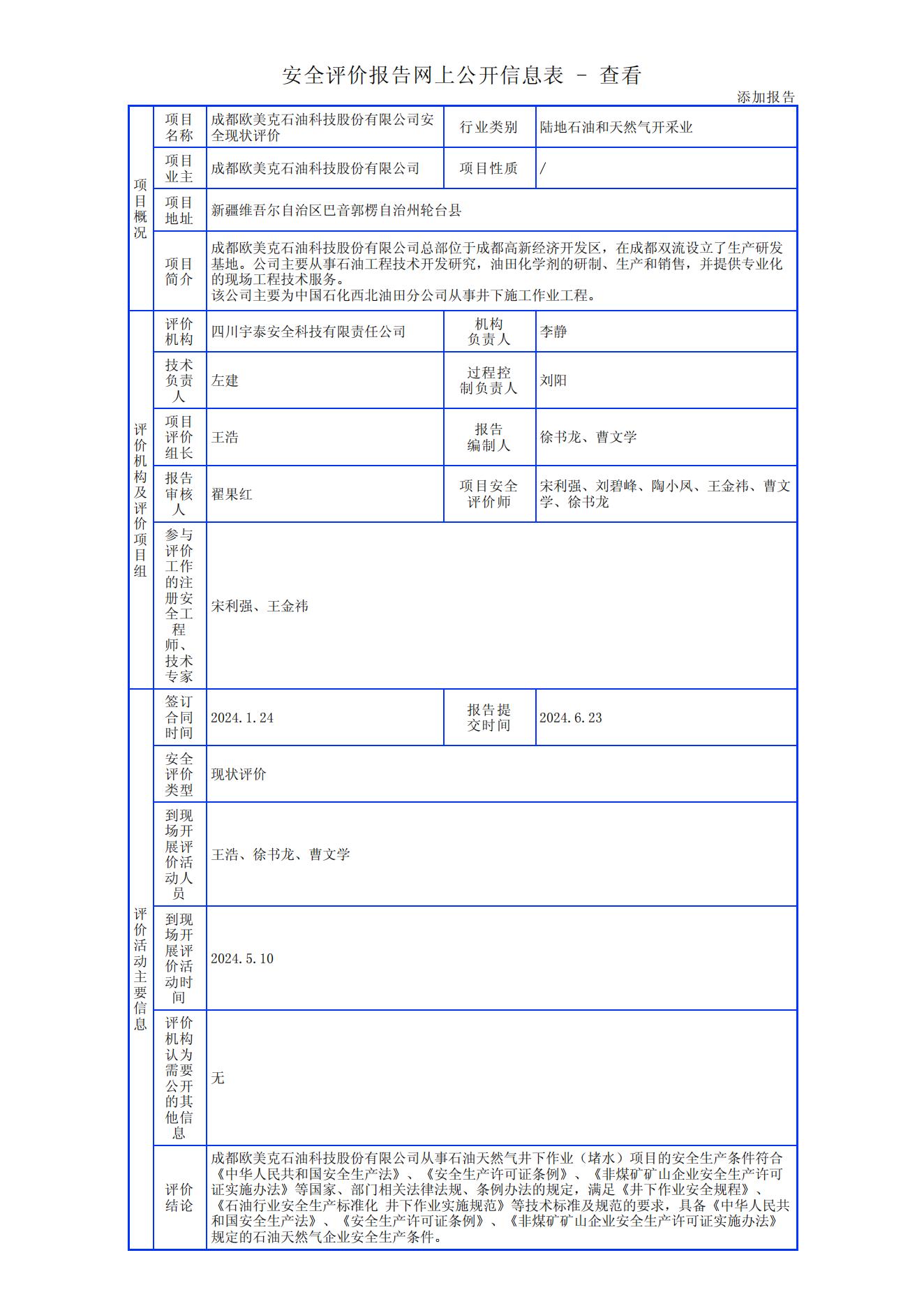 » 成都欧美克石油科技股份有限公司安全现状评价报告