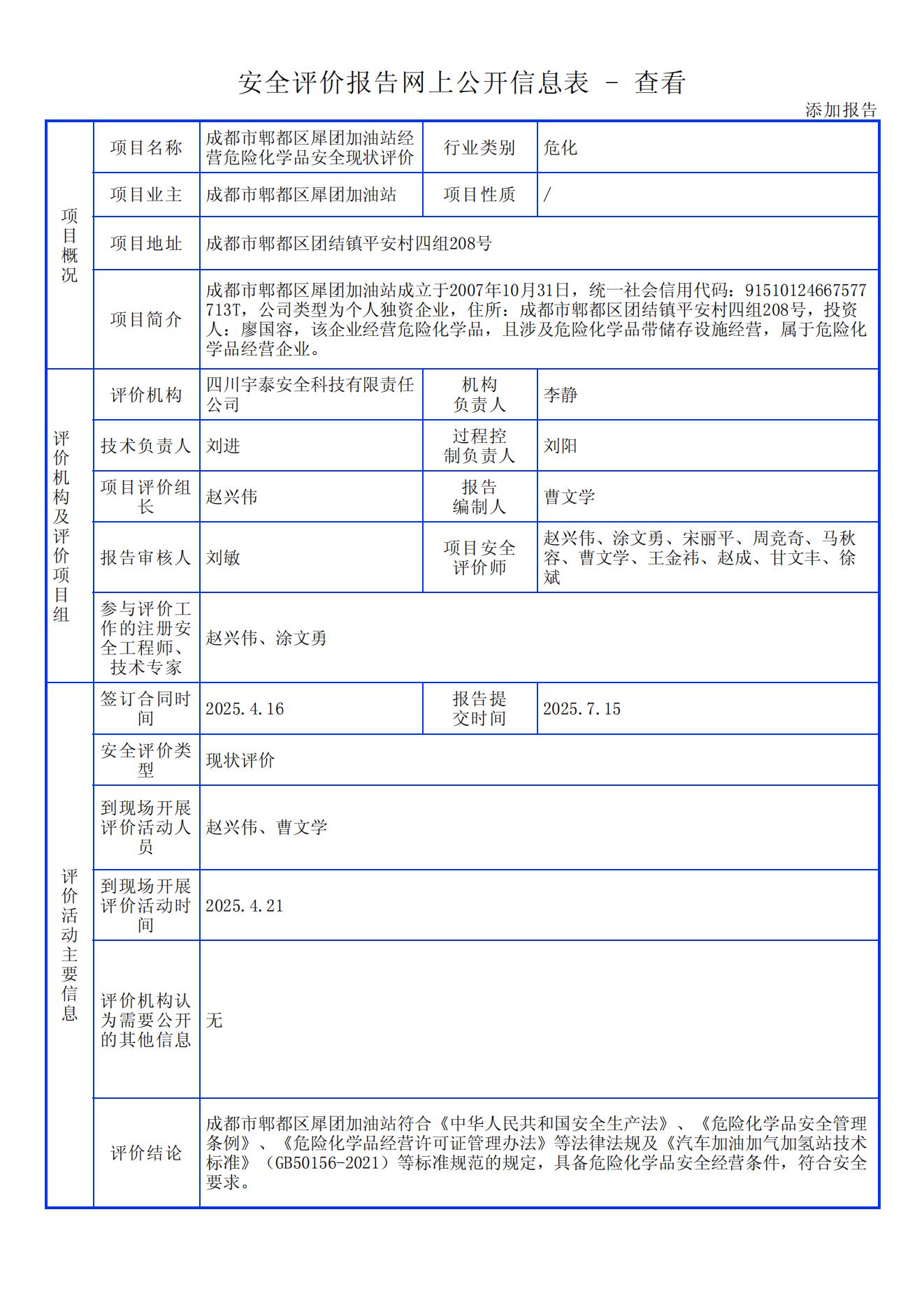 成都市郫都区犀团加油站经营危险化学品安全现状评价报告