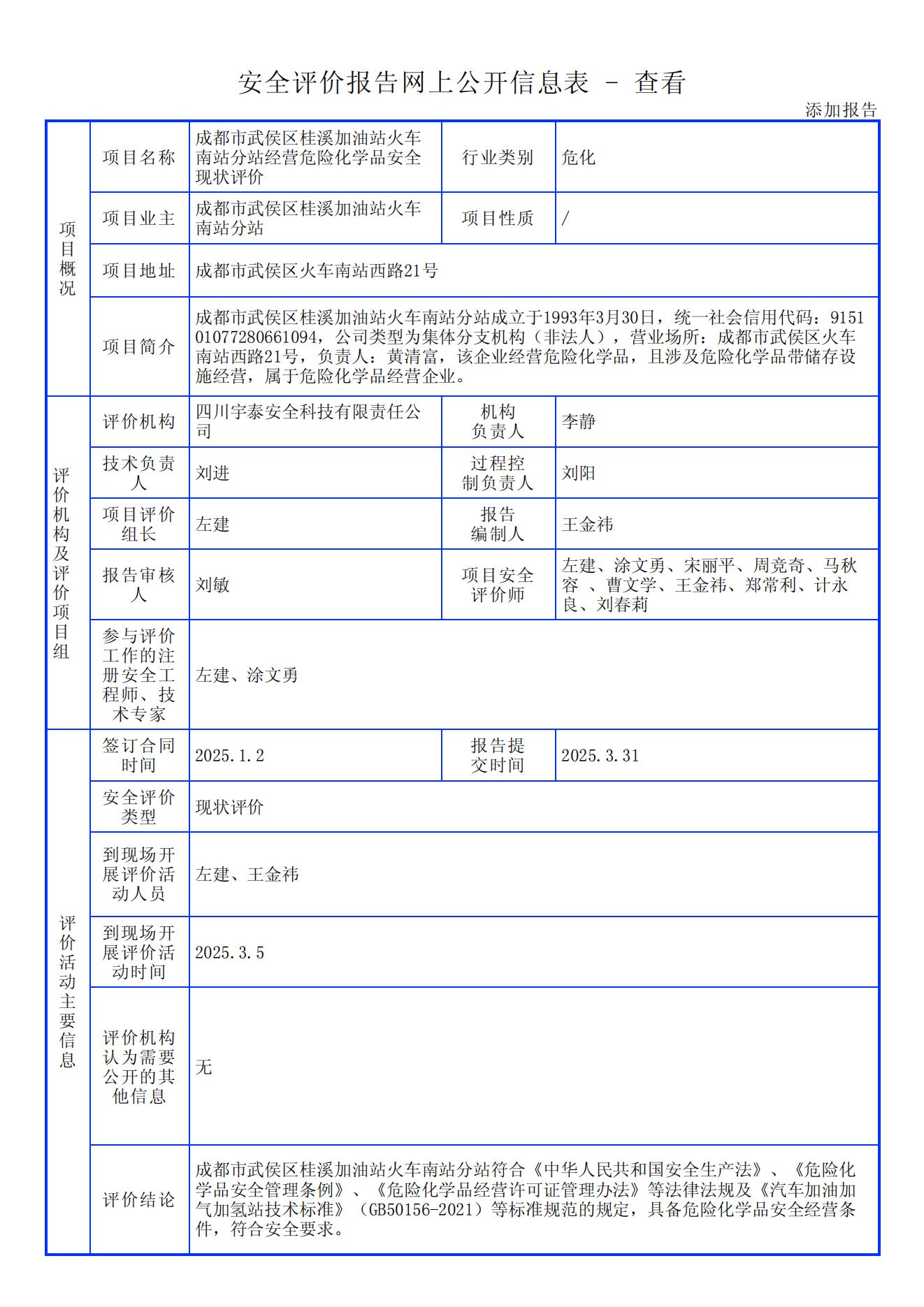 成都市武侯区桂溪加油站火车南站分站经营危险化学品安全现状评价报告