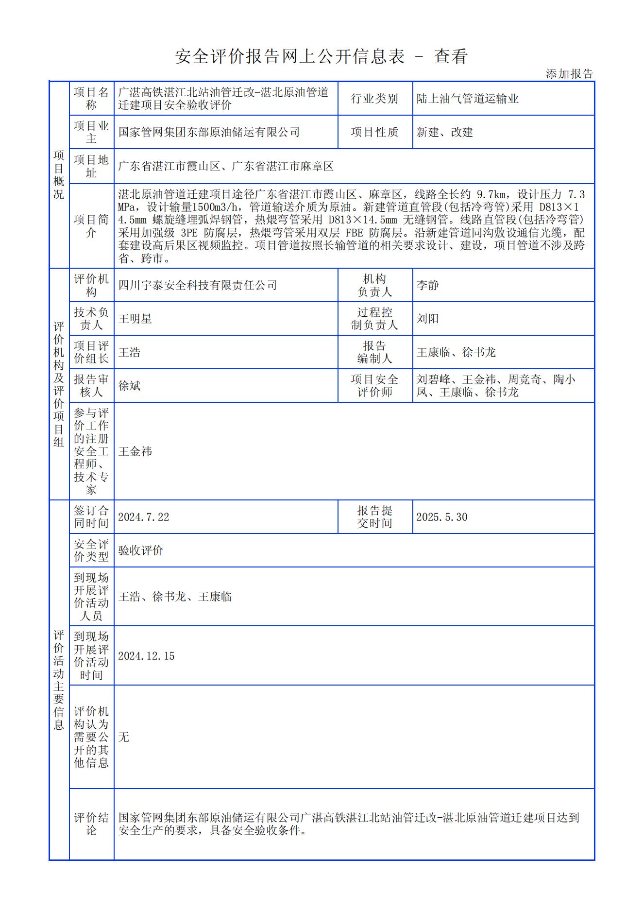 » 广湛高铁湛江北站油管迁改-湛北原油管道迁建项目安全验收评价报告