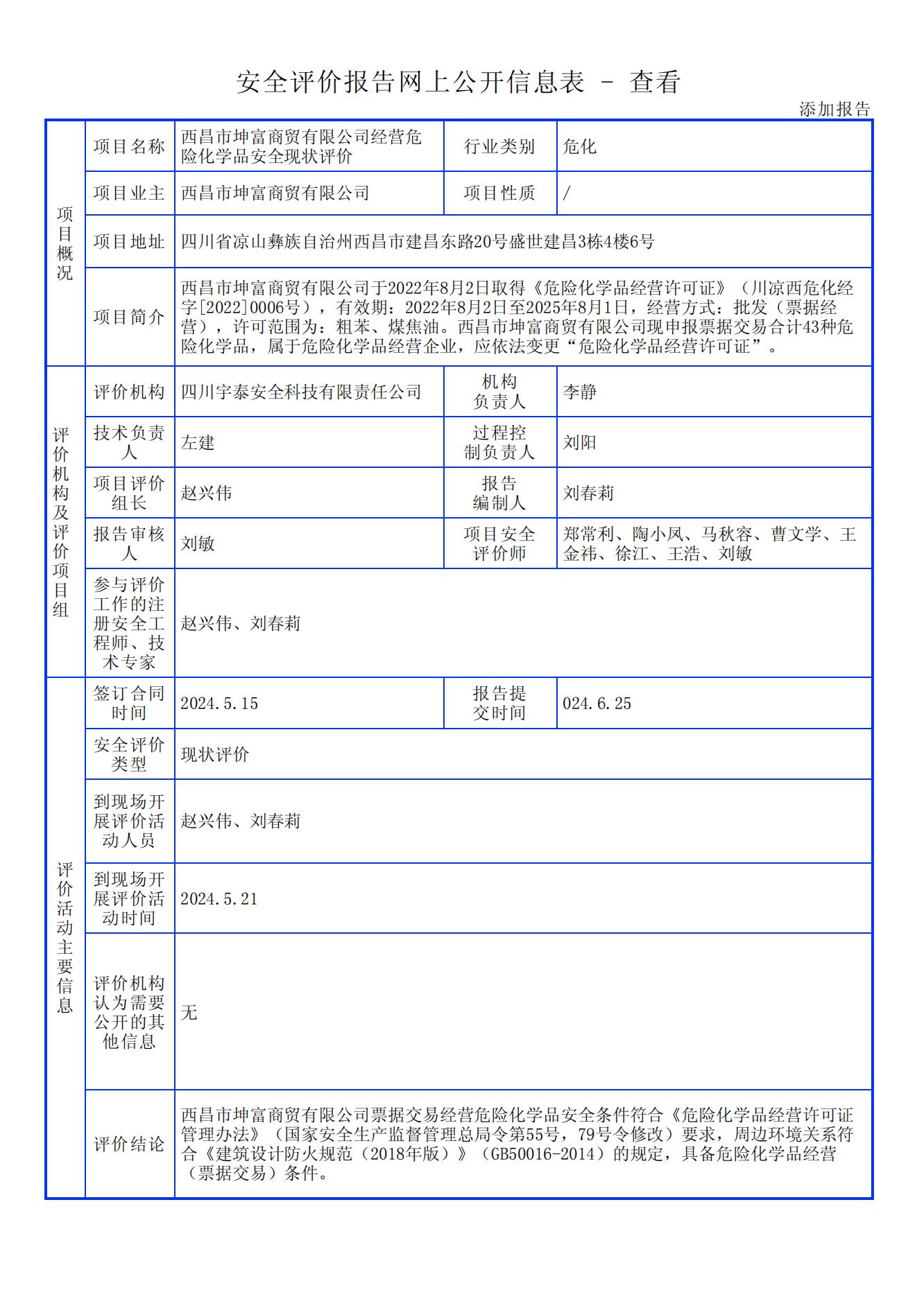 西昌市坤富商贸有限公司经营危险化学品安全现状评价报告