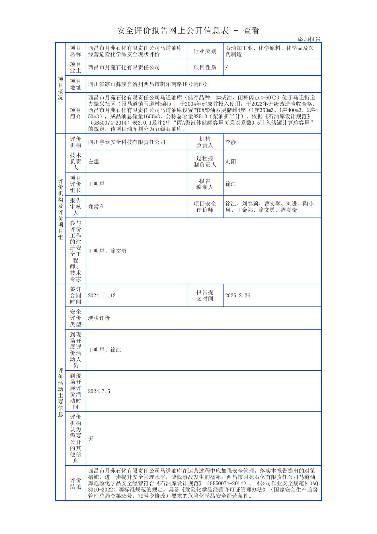 西昌市月苑石化有限责任公司马道油库经营危险化学品安全现状评价报告