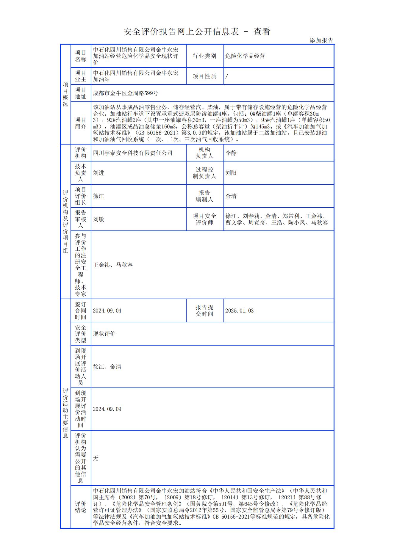 中石化四川销售有限公司金牛永宏加油站经营危险化学品安全现状评价报告