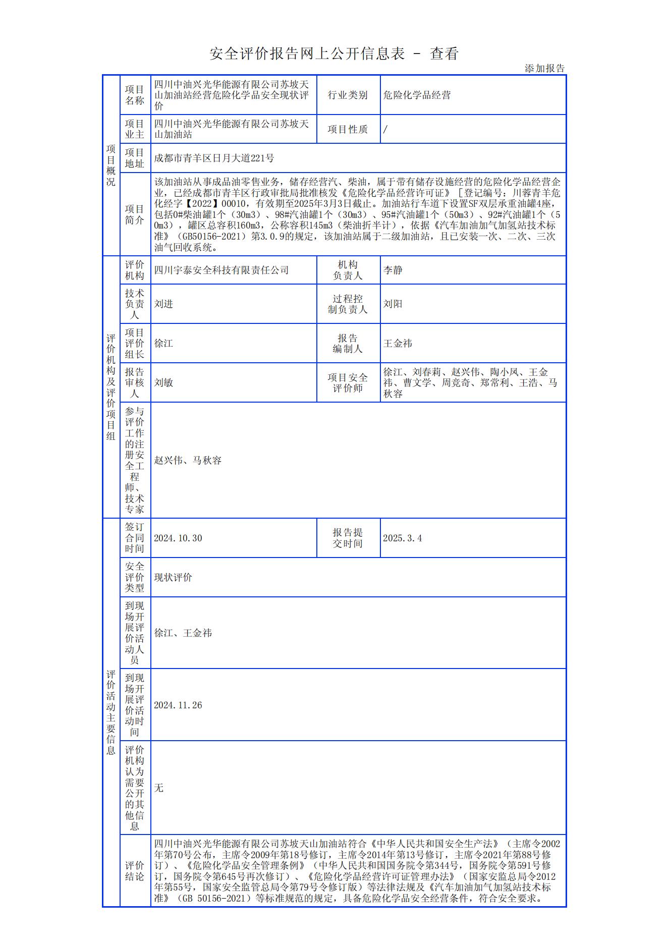 四川中油兴光华能源有限公司苏坡天山加油站经营危险化学品安全现状评价报告