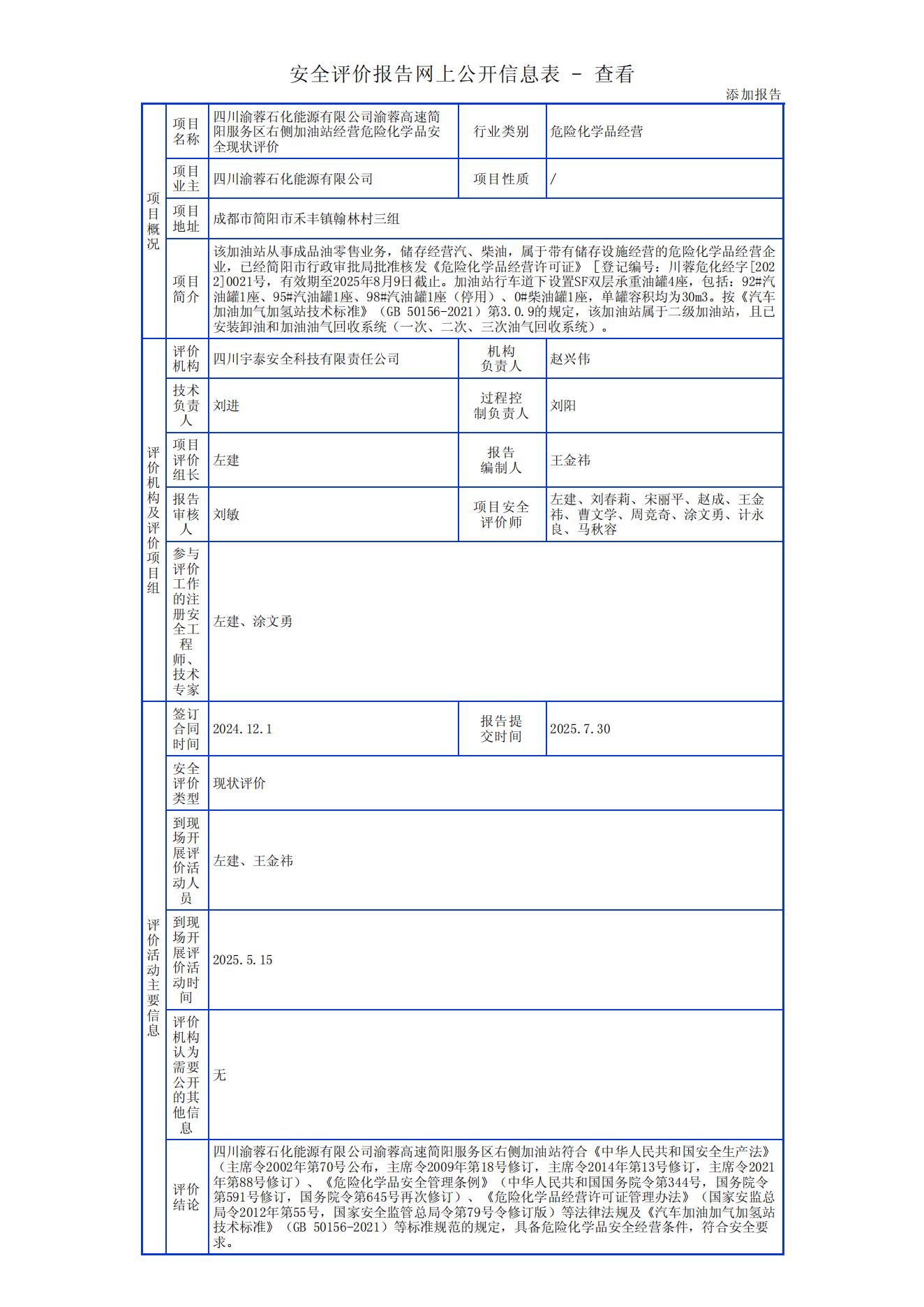 四川渝蓉石化能源有限公司渝蓉高速简阳服务区左侧加油站经营危险化学品安全现状评价报告