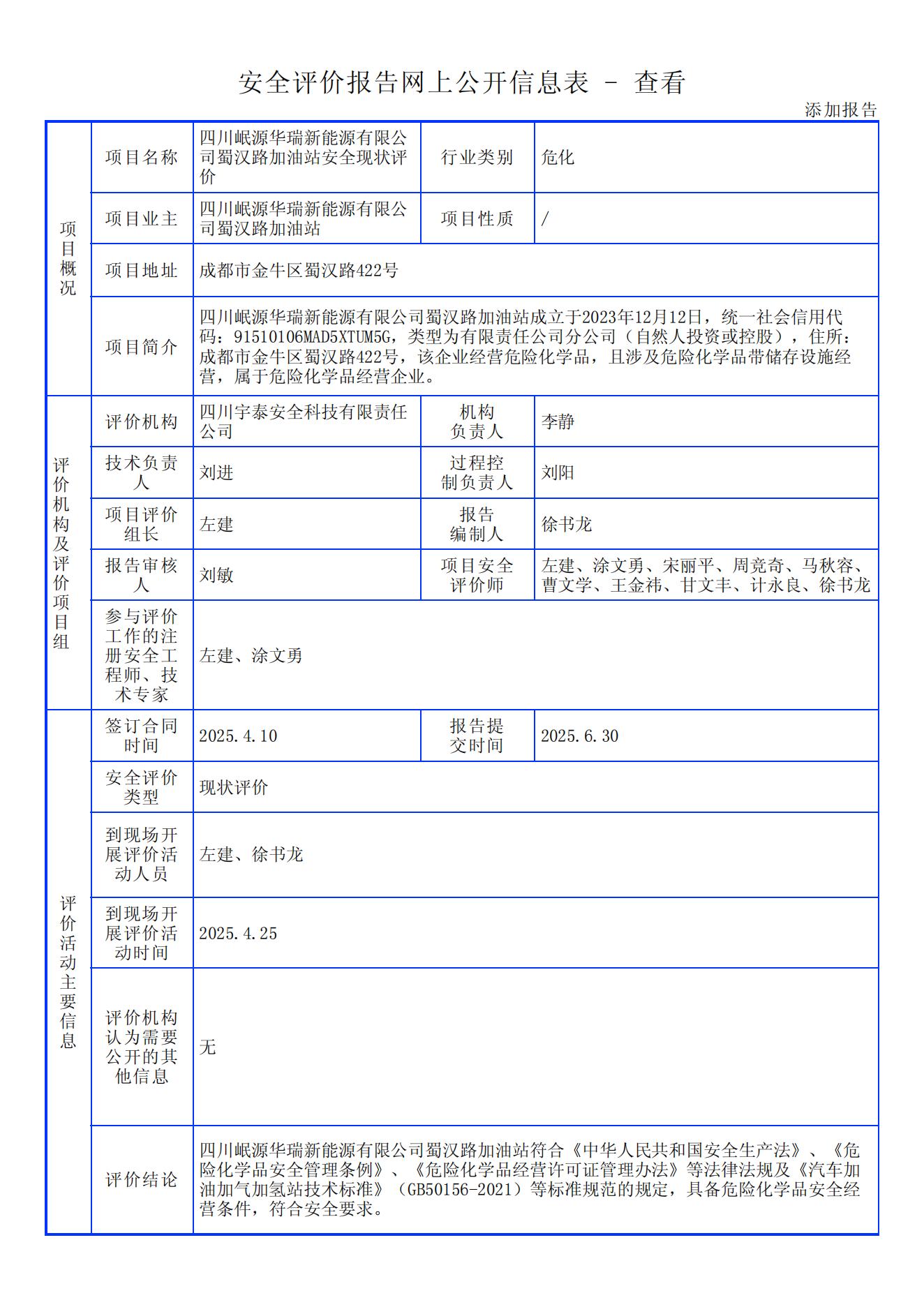 四川岷源华瑞新能源有限公司蜀汉路加油站安全现状评价报告