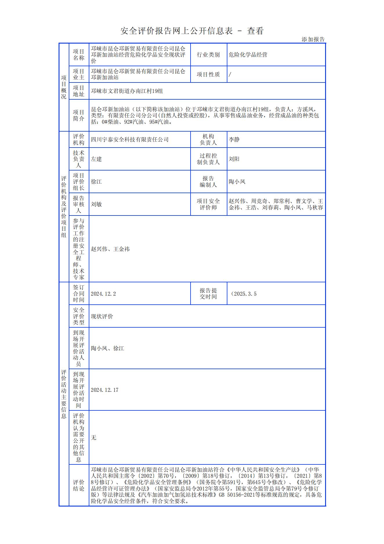 邛崃市昆仑邛新贸易有限责任公司昆仑邛新加油站经营危险化学品安全现状评价报告