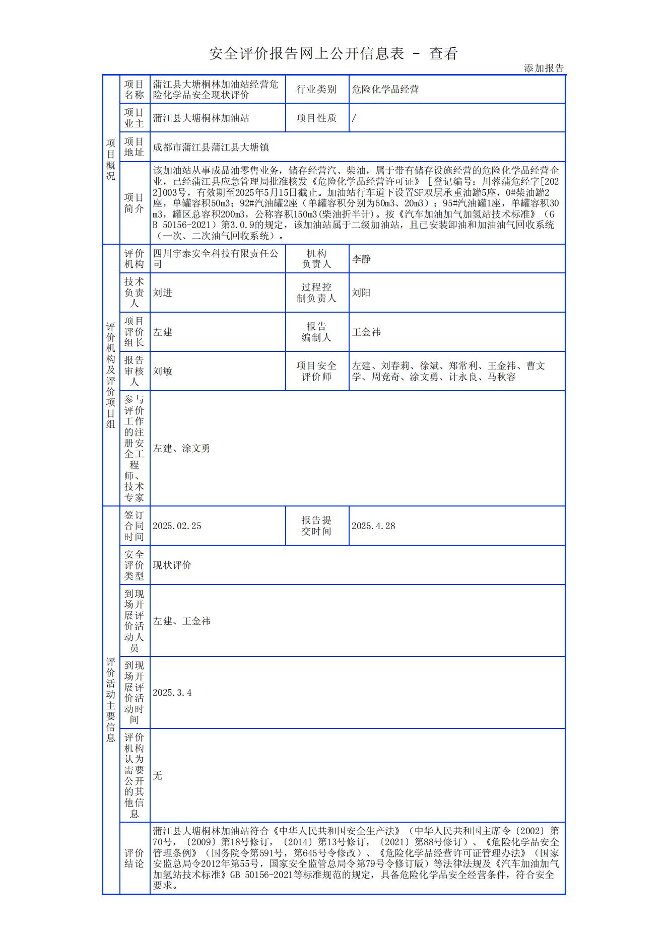 蒲江县大塘桐林加油站经营危险化学品安全现状评价报告