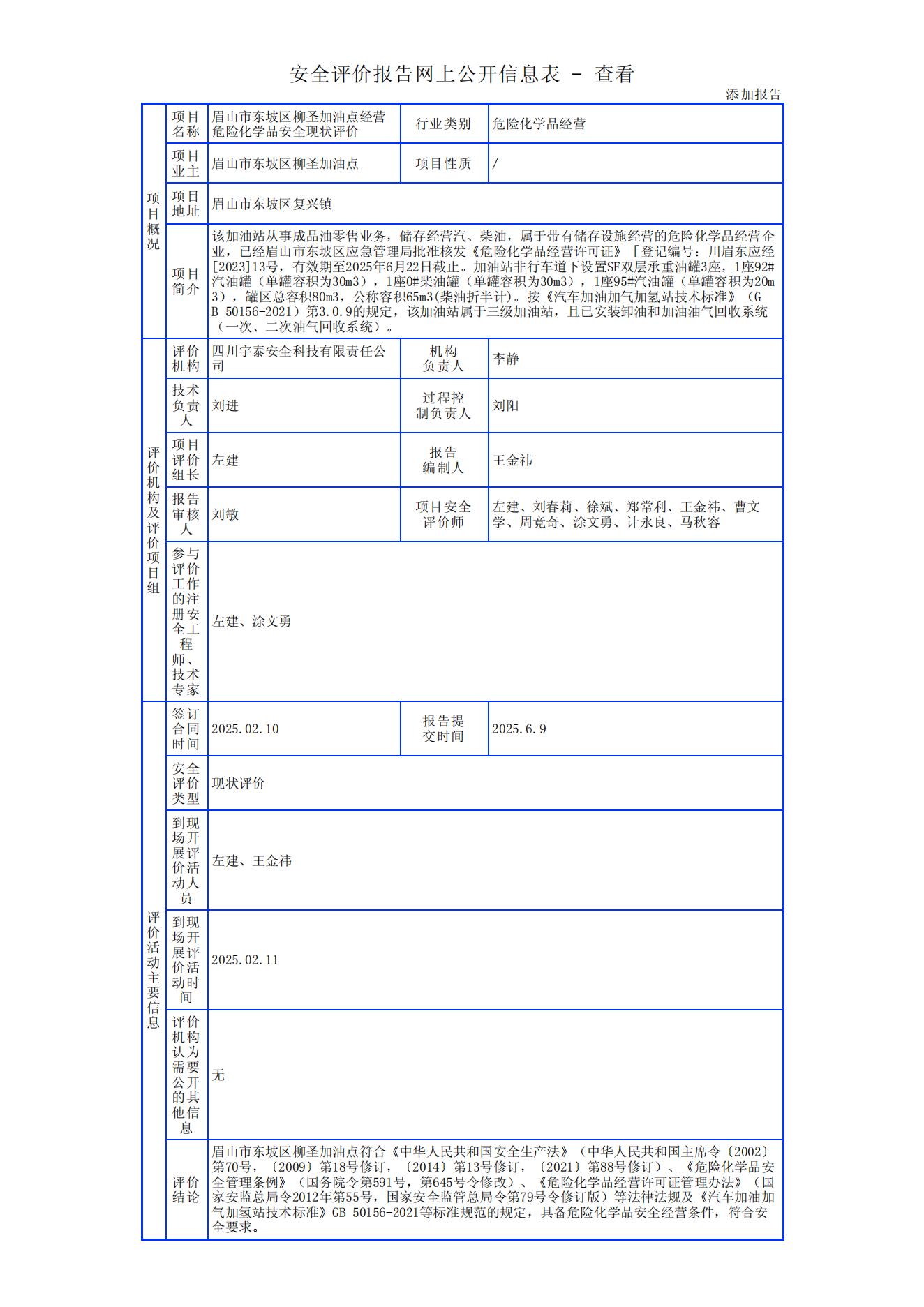 眉山市东坡区柳圣加油点经营危险化学品安全现状评价报告