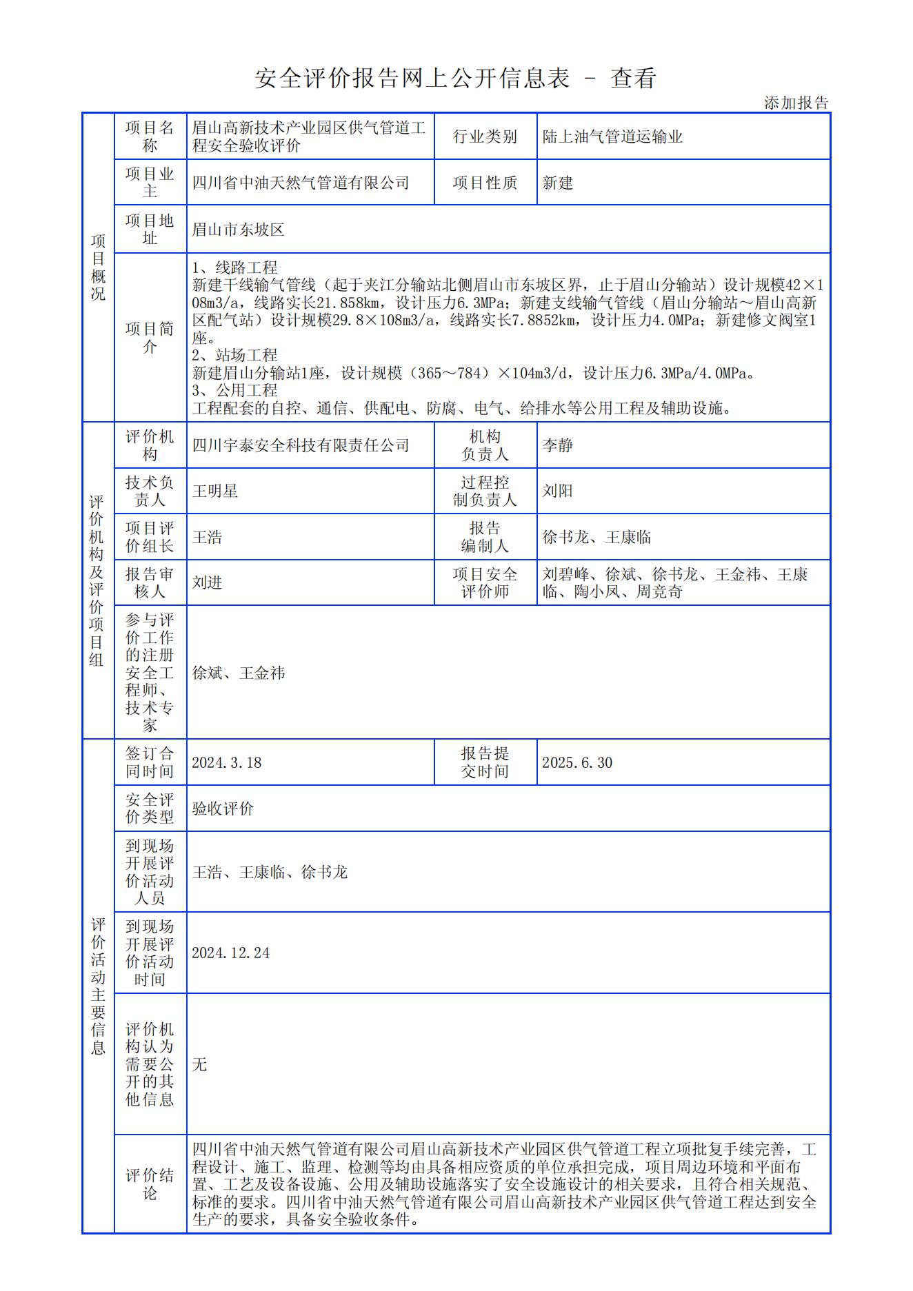 » 眉山高新技术产业园区供气管道工程安全验收评价报告