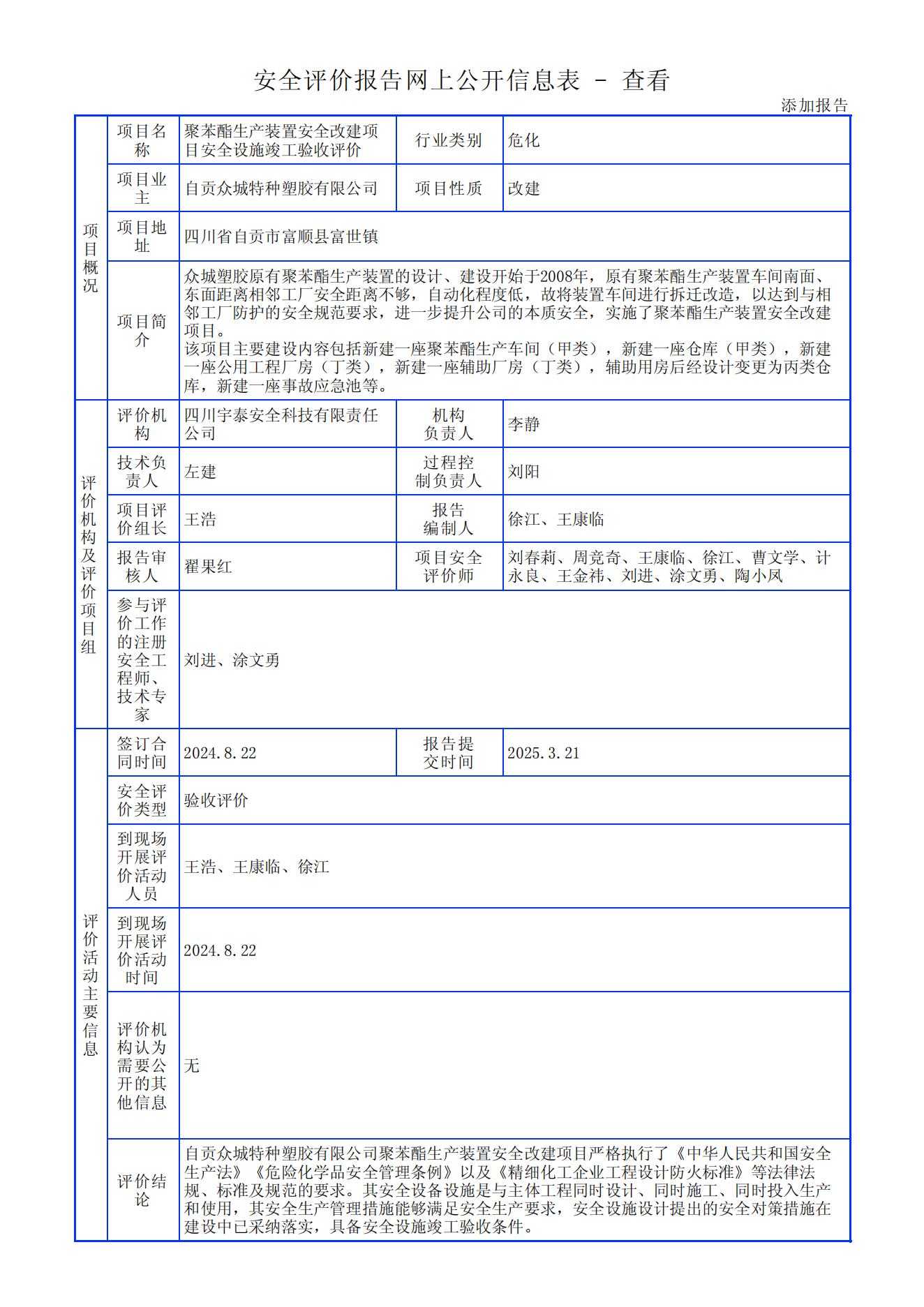 自贡众城特种塑胶有限公司聚苯酯生产装置安全改建项目安全设施竣工验收评价报告