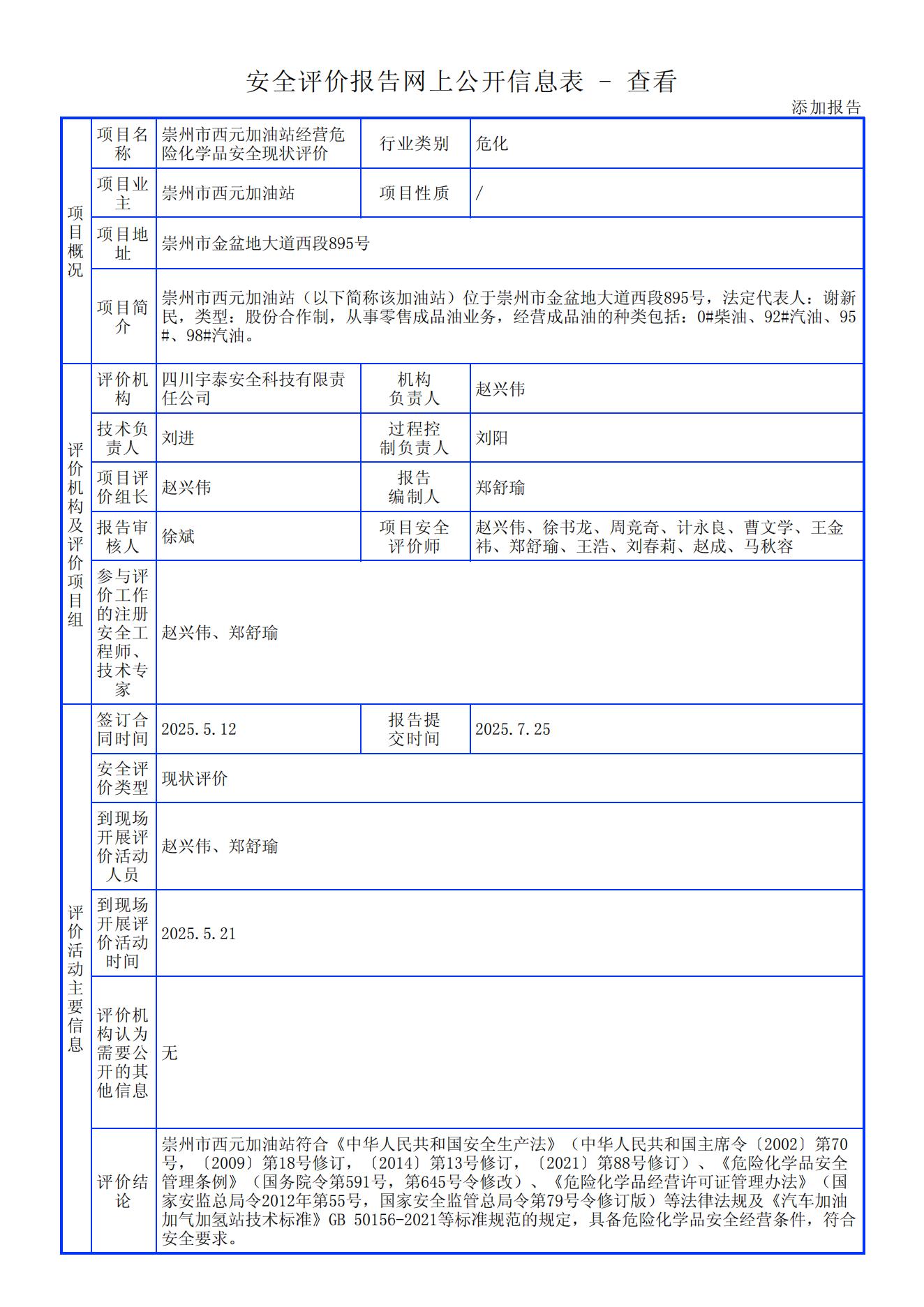 崇州市西元加油站经营危险化学品安全现状评价报告