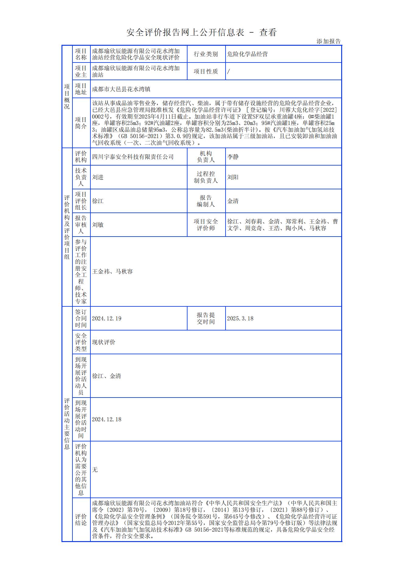 成都瑜欣辰能源有限公司花水湾加油站经营危险化学品安全现状评价报告